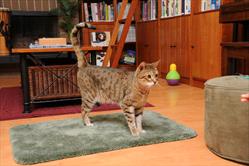 Stand or sit facing your cat, place the mat between your feet and your cat. Place a treat on the center of the mat, and mark using the clicker or “yes” to reinforce as your cat walks onto the mat. To keep the exercise fast-paced and exciting, toss a treat one to two feet off the mat, then place another treat on the mat, marking when your cat walks back onto the mat. Tossing treats off the mat is used to move the cat quickly off the mat for speedy, exciting repetitions. Practice this exercise until your cat runs to the mat with all four feet on the mat for at least eight out of 10 repetitions, then move to step two.
