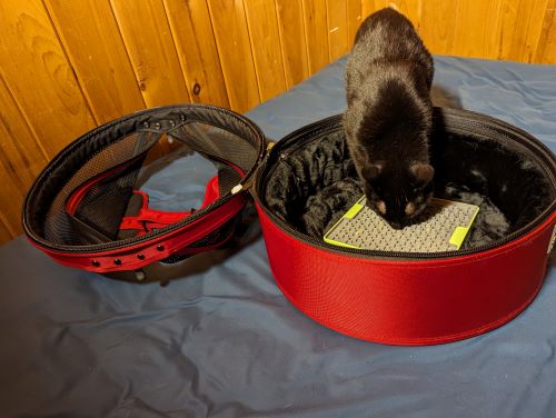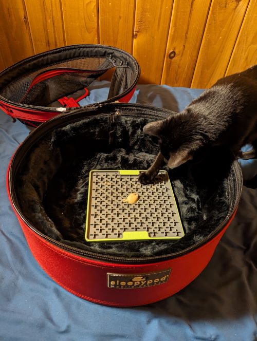You can also use these methods to carrier train your cat. Again, start early to get your cat comfortable with the process before you need it, and instead of bringing the carrier to your cat, leave it out in an area where they like to spend time during the day. Do this well in advance of your departure (weeks to months) so it doesn’t raise suspicion or cause your cat to flee. Every day, place the lickable mat with special treats inside the carrier, just like methods two and three outlined above.